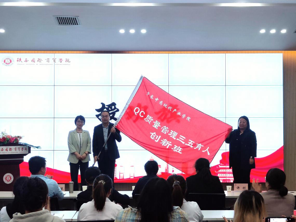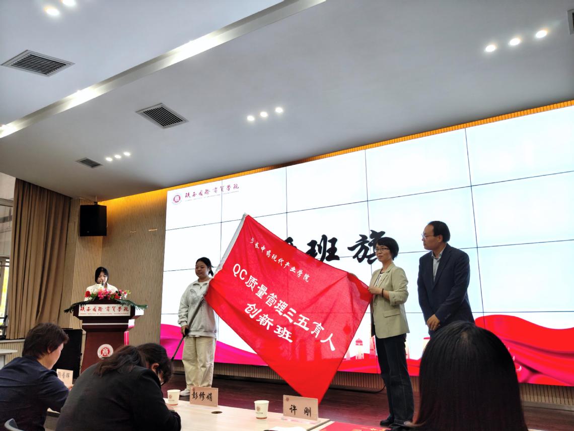 授班旗仪式作为仪式高潮,将现场氛围推向顶点。药学院副院长韩小娟手持象征班级精神与责任使命的班旗,郑重授予班主任及副班主任,并由班主任将班旗传递给班长杨茜雅同学。这面班旗不仅是班级精神的象征,更凝聚着校企双方对学员“成长为中药行业高素质QC人才”的殷切期望。班长接过班旗时,全体学员自发热烈鼓掌,眼神中满是对中药事业的坚定与担当,班级凝聚力与使命感瞬间升华。