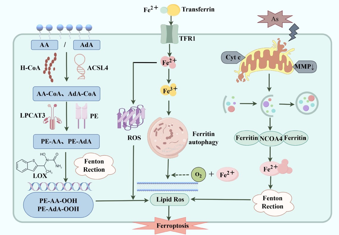 铁死亡在 T2DM 病理过程中起关键作用,其通过多途径参与 T2DM 发病:溶血磷脂酰胆碱酰基转移酶 3(LPCAT3)与酰基辅酶 A 氧化酶长链家族成员 4(ACSL4)调控多不饱和脂肪酸磷脂代谢生成过氧化脂质,诱发铁死亡;铁死亡与体内铁蛋白水平相关,细胞铁代谢失衡致 Fe²⁺过量蓄积引发脂质过氧化,高糖环境或升高组织铁蛋白水平,且铁储存量与 T2DM 风险正相关,铁死亡还可通过损伤胰腺细胞、影响肝脏糖代谢及 miR-144-3p 调控推动疾病进展;长期接触砷也可影响胰腺 β 细胞功能、肝脏糖代谢及组织胰岛素敏感性,损伤线粒体诱导自噬,经 NCOA4 介导释放 Fe²⁺引发铁死亡,最终致细胞凋亡与胰岛素分泌受损。