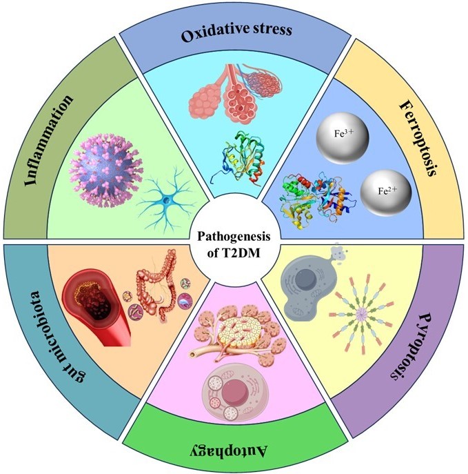 糖尿病是全球高发的慢性代谢性疾病,发病率持续攀升且呈现年轻化趋势,其中,2型糖尿病(T2DM)占比超过90%,其引发的胰岛素抵抗、胰岛 β 细胞损伤及多器官并发症,已成为威胁人类健康的重大公共卫生问题。目前临床常用降糖药物虽能控制血糖,但存在低血糖风险高、胃肠道副作用明显、长期使用易产生耐药性等局限,亟需探索安全有效、多靶点调控的新型治疗方案。文章立足中医药“整体调节、辨证施治” 优势,系统梳理了近五年 T2DM 发病机制与中医药干预的最新研究成果,为中药新药研发和T2DM治疗提供了重要理论依据与新方向,并突破传统“炎症 - 氧化应激” 二元机制认知,首次从炎症、氧化应激、铁死亡、焦亡、自噬、肠道菌群六大维度,系统阐释 T2DM 的复杂病理网络。