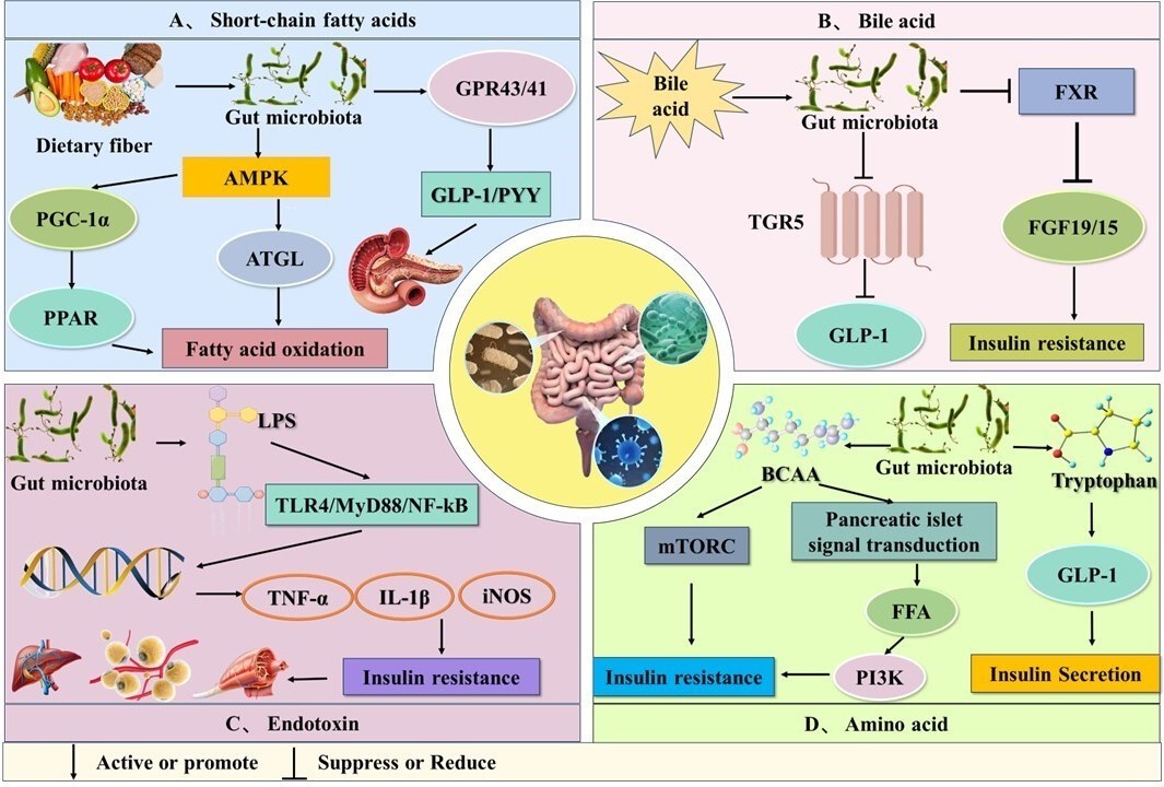 肠道菌群及其代谢产物主要通过三类机制损害胰岛功能、加剧T2DM相关代谢失调:其一,菌群发酵膳食纤维生成的短链脂肪酸(如乙酸、丙酸、丁酸),可通过调节肠道屏障、调控糖代谢激素正向参与糖代谢,而菌群失调会致其生成异常,削弱糖代谢调控作用并降低胰岛素敏感性;其二,菌群通过酶解改变胆汁酸结构与比例(如初级转次级),调控胆汁酸受体(如 FXR、TGR5)活性以影响糖脂代谢,失调则破坏胆汁酸平衡,减弱胰岛保护作用并扰乱糖脂代谢;其三,菌群失调会增加肠道革兰氏阴性菌内毒素(LPS)产生,还可能破坏肠道屏障促其入血,内毒素激活 TLR4/NF-κB 通路引发慢性炎症,既损胰岛 β 细胞功能,又降胰岛素敏感性,最终共同加剧 T2DM 病理进展。
