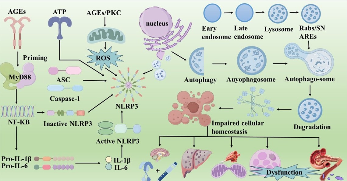 焦亡是由 Gasdermin 蛋白(GSDMDs)介导的炎症性程序性细胞死亡,其中 NLRP3 作为 NLR 家族成员及炎症反应关键调控因子,其构成的 NLRP3 炎症体需双信号激活; AGEs 可通过激活 NF-κB 途径储备该炎症体激活所需关键分子。此外,脂肪细胞功能障碍可诱发慢性炎症,而慢性高血糖、胰岛淀粉样多肽沉积则会引发炎症与细胞损伤,激活铁死亡。在自噬机制中,巨噬细胞自噬是T2DM的研究重点,核心过程为自噬小体包裹胞内成分并转运至溶酶体降解,产物循环再利用;若 RAB 失活、SNAREs 功能障碍等致自噬异常,会引发细胞稳态失衡及相关病理反应。此外,胰岛素敏感组织自噬障碍会损害胰岛素敏感性、减少胰腺胰岛素分泌,加剧 T2DM。