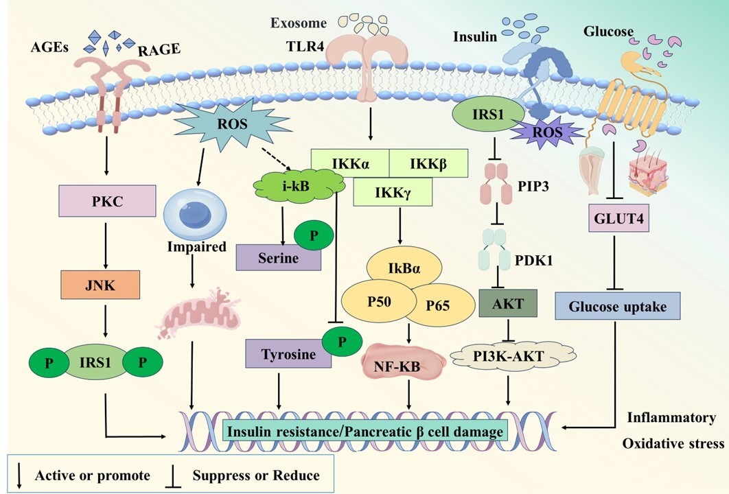 T2DM 发病与炎症密切相关:促炎性免疫细胞渗透胰岛及胰岛素敏感组织引发局部炎症,既损伤胰岛素分泌,又降低组织胰岛素敏感性,进而诱发疾病;发病后高血糖与代谢紊乱进一步激活炎症途径,形成恶性循环。慢性高血糖还促晚期糖基化终末产物(AGEs)生成,AGEs 结合受体 RAGE 后,经接头蛋白触发 PKC 活化,激活 JNK、MAPK/ERK 等信号级联,通过促胰岛素受体丝氨酸磷酸化干扰信号转导,加重胰岛素抵抗和高血糖,推动 T2DM 进展。氧化应激是胰岛 β 细胞功能障碍的关键因素:活性氧(ROS)通过干扰胰岛素信号、激活 NF-κB 促炎症、抑制 PDX-1 核浆转位及线粒体能量代谢,减少胰岛素合成分泌,加速疾病进展;OS 下调脂肪、骨骼肌中 GLUT4 表达,减少组织葡萄糖摄取,诱发胰岛素抵抗。